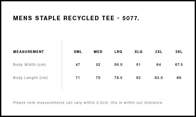Regular fit. Mid weight, 200 GSM, 28-singles, 80% recycled cotton 20% recycled polyester